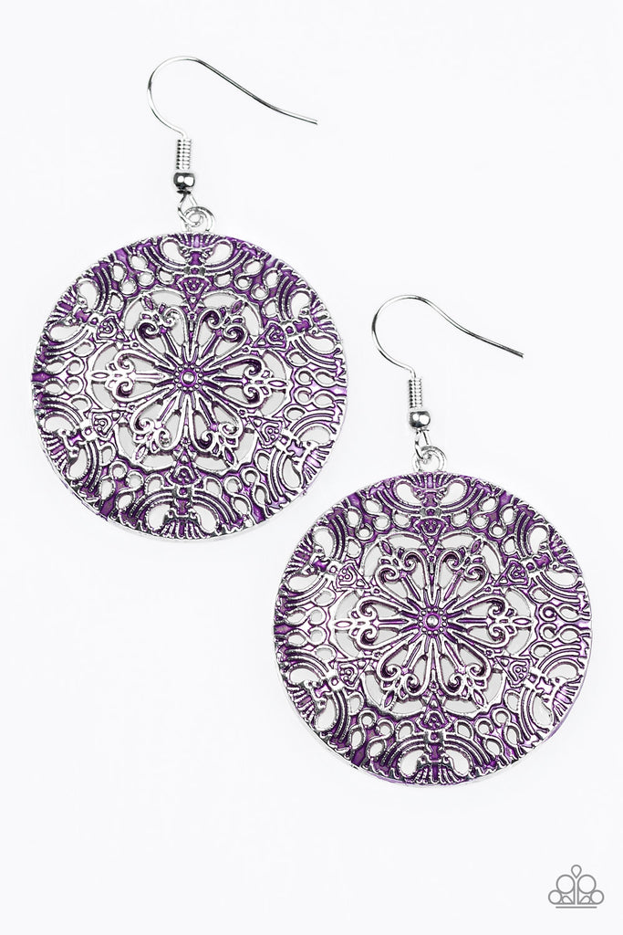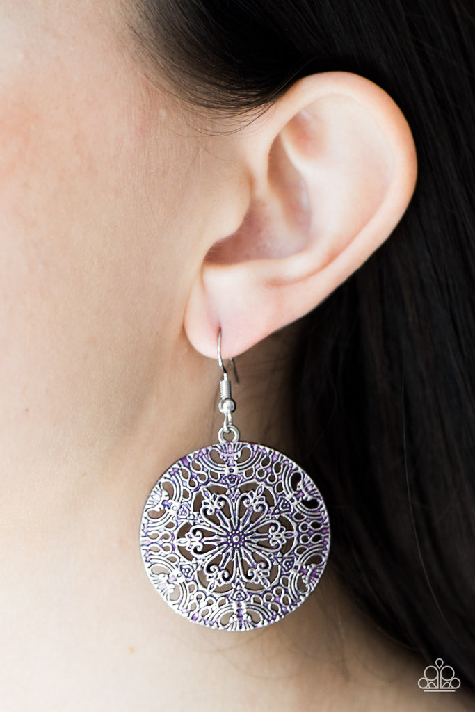Brushed in a distressed purple finish, an ornate circular frame swings from the ear in a whimsical fashion. Earring attaches to a standard fishhook fitting.